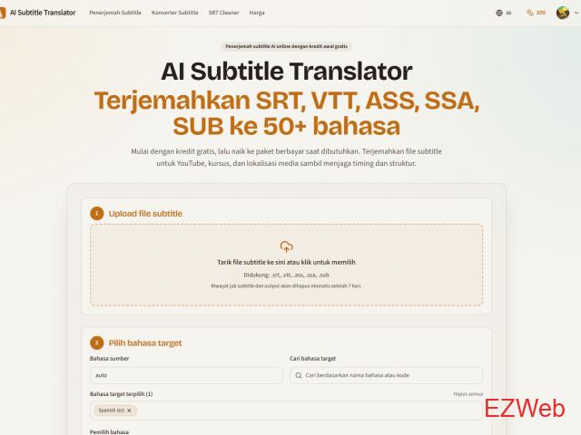 AI Subtitle Translator translates subtitle files (SRT, VTT, ASS, SSA, SUB) into 50+ languages with format-aware parsing that preserves cue order and timestamps. It offers free starter credits, transparent credit estimates, multi-language output in one run, and paid plans or one-time credit packs for subtitle localization workflows.