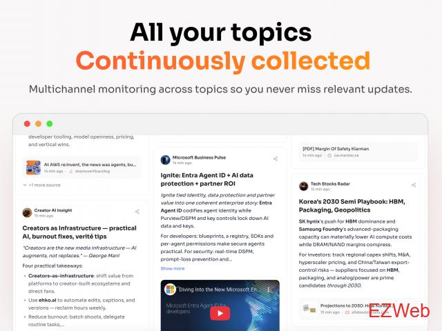 - AI-Powered Content Discovery: Monitors news, blogs, newsletters, RSS feeds, and social media, extracting core arguments and key data points.